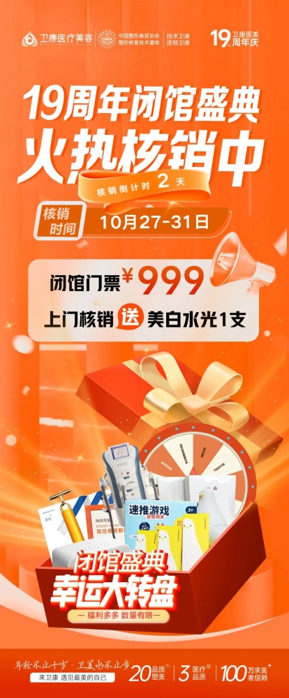 卫康医美19周年闭馆盛典,核销仅剩1天!!!一年一次钜惠到底,活动时间:10月27日-31日