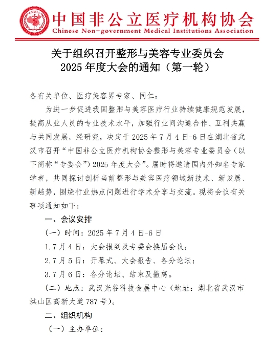 为进一步促进我国整形与美容医疗行业持续健康规范发展,提高从业人员的专业技术水平,加强行业间沟通合作、互利共赢与共同发展,经研究,决定于2025年7月4日-6日在湖北省武汉市召开“中国非公立医疗机构协会整形与美容专业委员会(以下简称“专委会”)2025年度大会”。